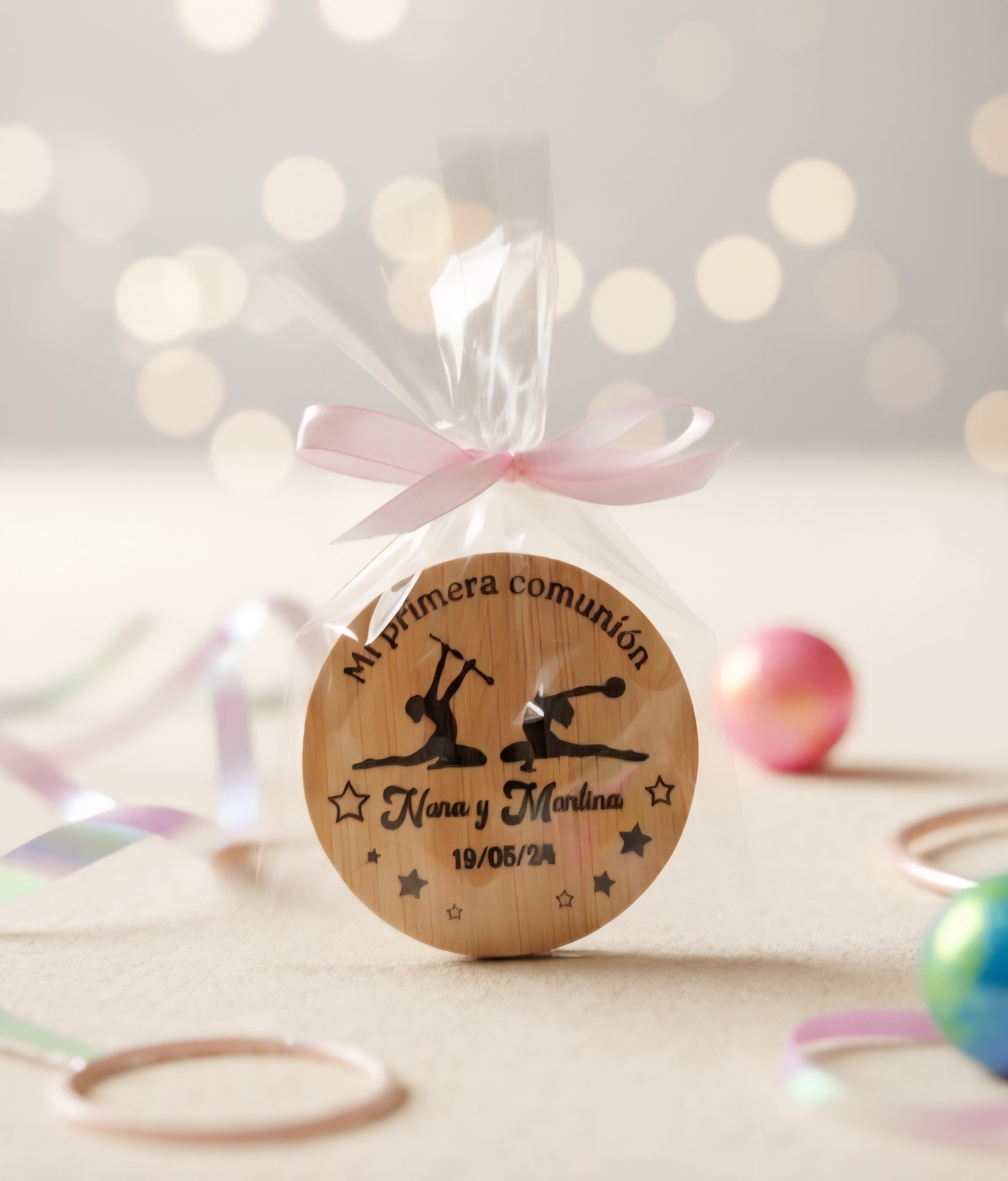 Presented in an individual bag with a ribbon.