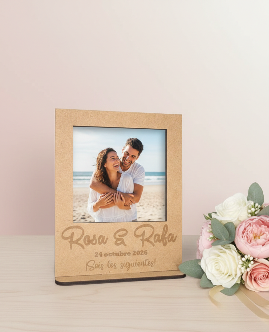 Surprise the bride and groom-to-be with our elegant wedding gift photo frame, made of 3mm thick MDF wood. It can be personalized with the bride and groom's names and wedding date, making it a unique and special keepsake.
