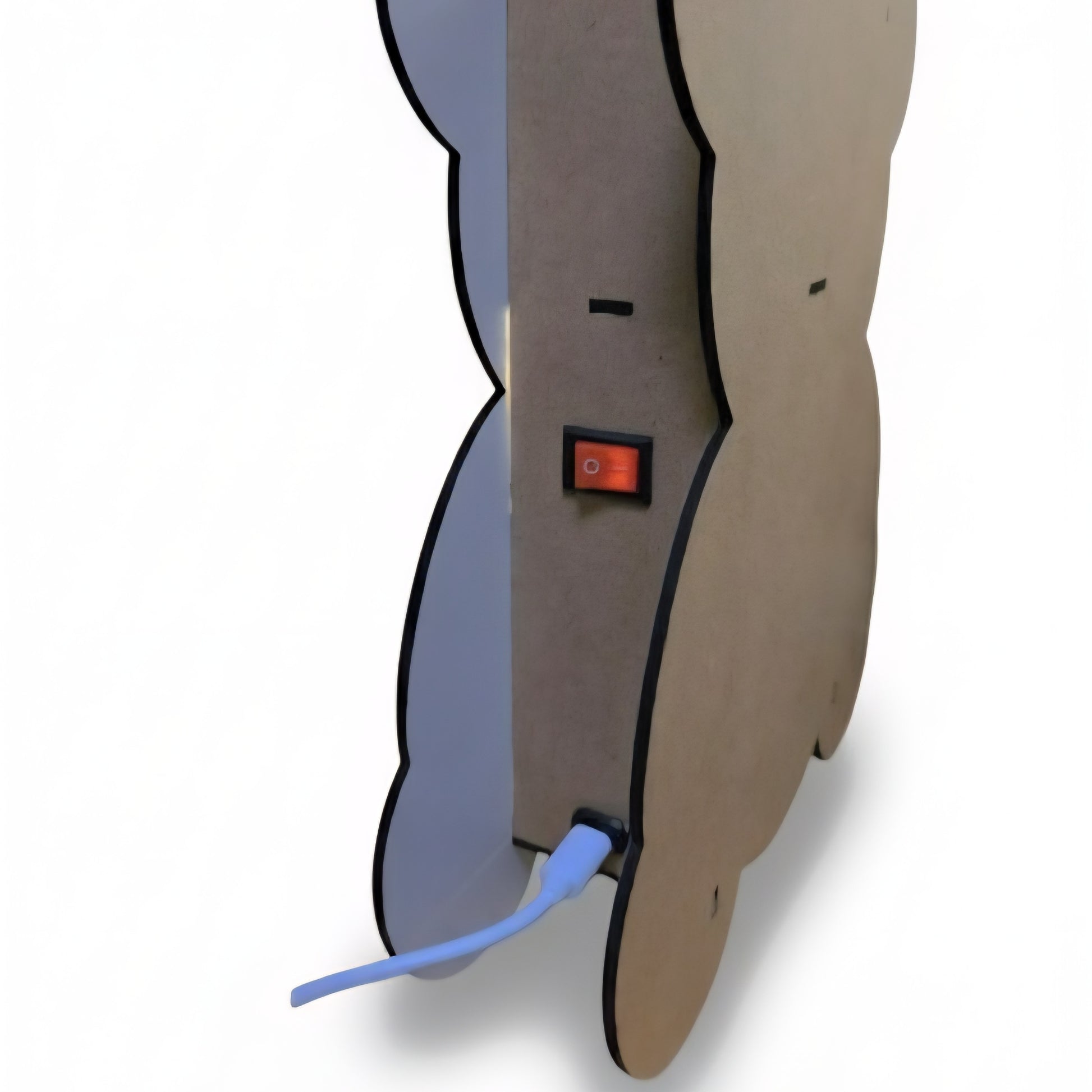 Esta lámpara es mucho más que un simple objeto decorativo; es una luz quitamiedos y un recuerdo inolvidable. Fabricada con madera natural y detalles en blanco, presenta un diseño dulce y acogedor de 25 cm de alto y solo 5 cm de profundidad, perfecta para cualquier mesita de noche o estantería. El ancho varía ligeramente según la figura elegida (entre 20 y 25 cm).